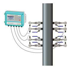 多聲道插入式超聲波流量計由主機和插入式傳感器組成,主機和傳感器可任意組合,可實現單聲道、雙聲道、四聲道測量,滿足不同精度、不同使用場景需要。